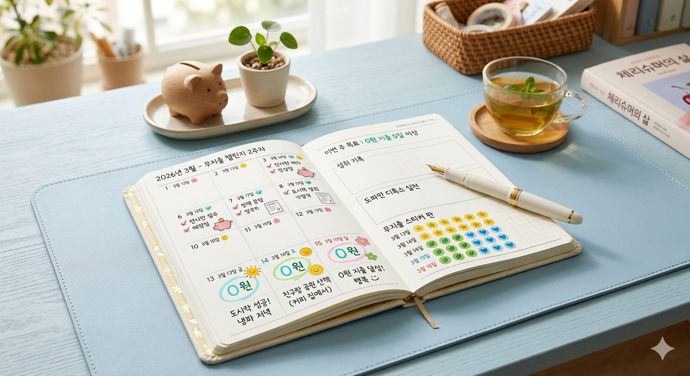 매일 저녁 10분, 오늘 쓴 돈을 가계부에 적거나 블로그에 '무지출 일기'를 남겨보세요. 지출이 전혀 없는 날(No Spend Day)의 성취감은 쇼핑을 할 때보다 훨씬 건강한 보상 체계를 형성합니다. 이는 곧 도파민 디톡스로 이어져, 적은 소비로도 큰 행복을 느끼는 뇌 구조를 만들어 줍니다. 결국 기록이 곧 자산이 되는 셈입니다.